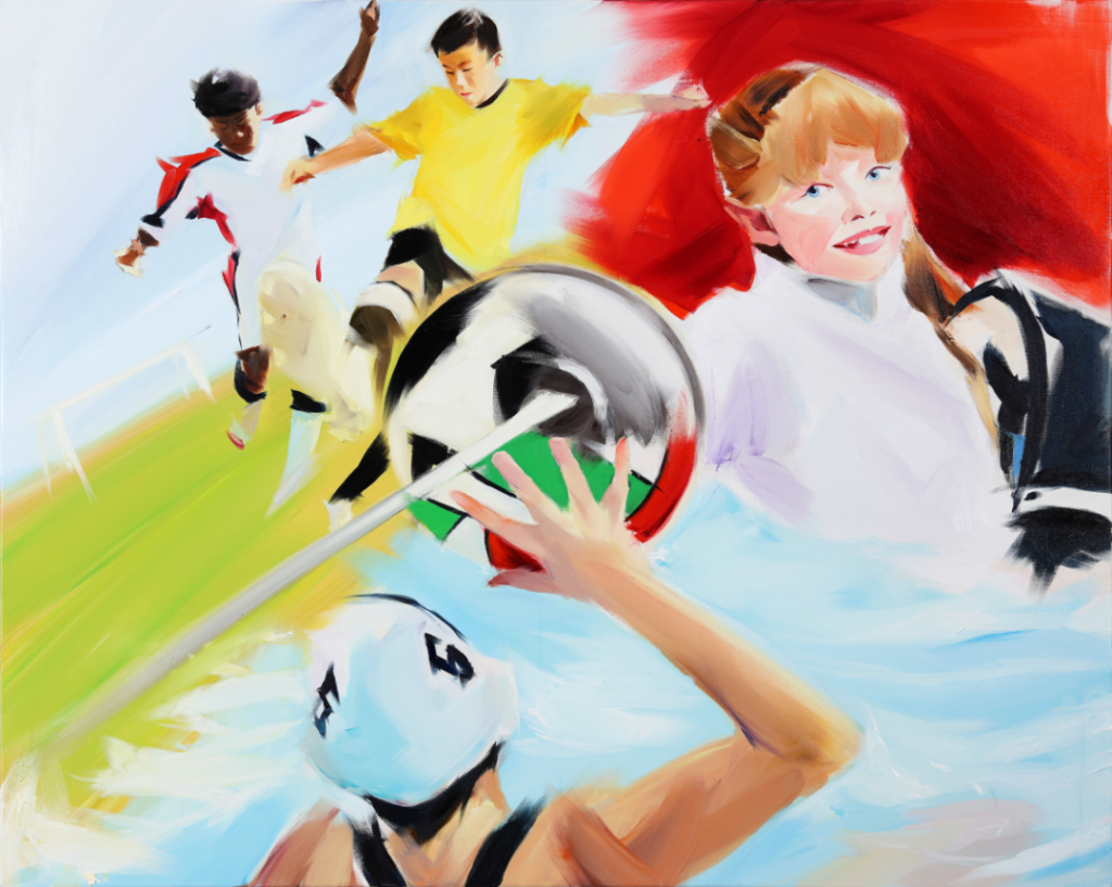 Il linguaggio pittorico di Fontanari, fatto di luci, campiture di colore e parti volutamente lasciate alla materia pittorica, contribuisce a rendere l’immagine viva e aperta, quasi a suggerire che ciò che conta non è il singolo protagonista ma l’insieme: la comunità temporanea che nasce attraverso lo sport.